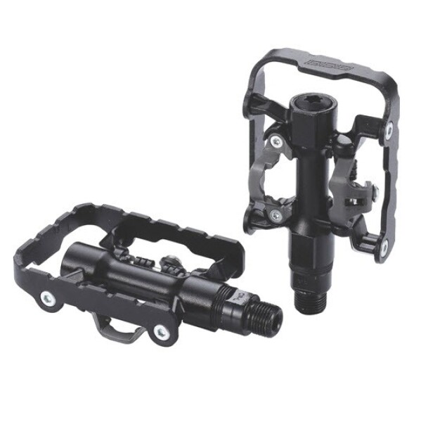 Двухсторонние педали. Одна сторона контактная SPD, другая сторона оснащена противоскользящей алюминиевой рамкой для уличной обуви.