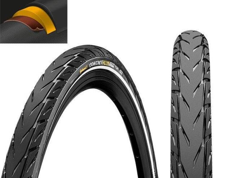 Покрышка Contact Plus City - скоростное и эффективное решение для городских и прогулочных велосипедов. Благодаря фирменным технологиям Safety System и E50 покрышка гибкая и легкая, при этом обладает высоким показателем устойчивости к проколам и порезам, а также совместима с электробайками. Протектор уверенно ведет себя при маневрировании и торможении, при этом обладает великолепным накатом. Хорошо раскрывается потенциал покрышки на сухом и влажном асфальте. Совместима с колесами 28", имеет популярную ширину 1,6", располагает к установке как спереди, так и сзади. В своем оснащении имеет стальной корд, держит давление до 73 PSI, посадочный размер (ETRTO) 42-622, обладает приемлемым весом- 990 гр. С момента основания в 1871 году, Continental работает для достижения поставленной цели: максимально безопасное движение с эффективностью и удовольствием. Этот огромный концерн выпускает покрышки и камеры, не уступающие по качеству автомобильным.